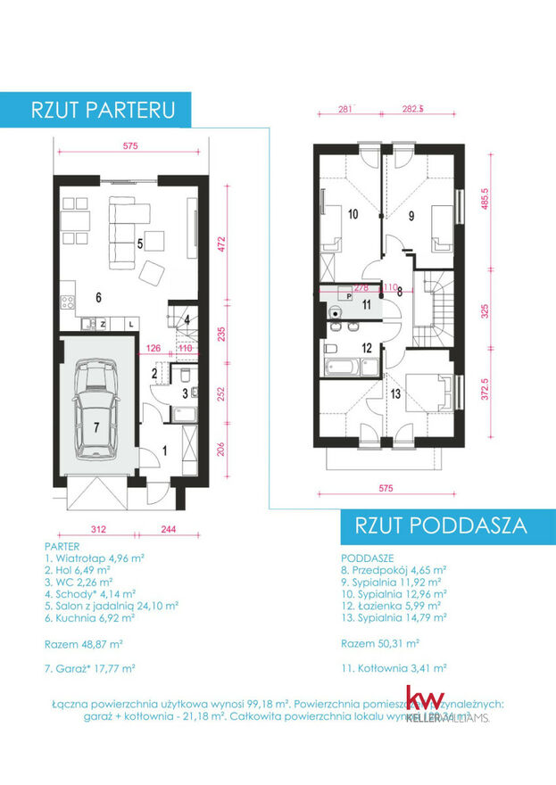 Powierzchnia pomieszczeń przynależnych: garaż + kotłownia - 21,18 m².