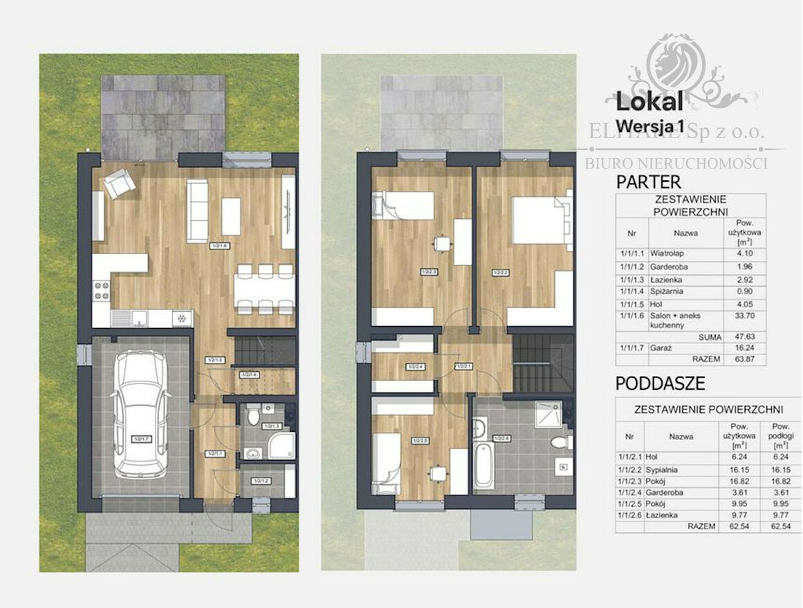Dom ma klasyczny układ, dwupoziomowy ze strefa dzienną z garażem w parterze (63,87m2) oraz strefą nocną na piętrze (62,54m2):